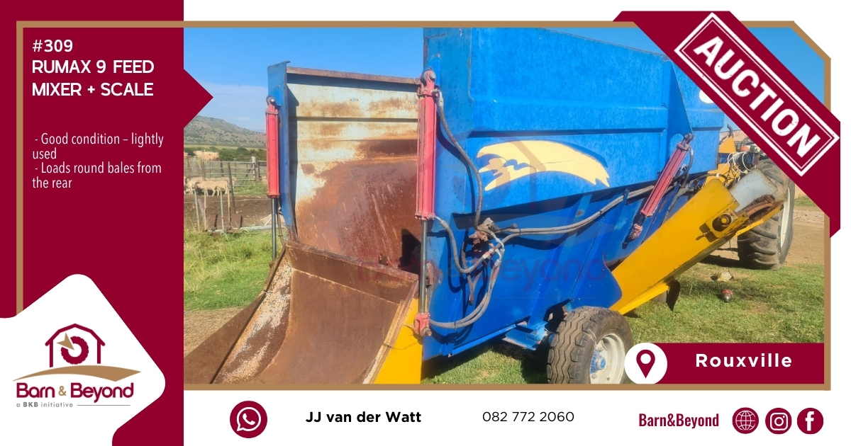 Effortlessly handle and mix your feed with this lightly used RUMAX 9. Designed to load round bales from the rear, it makes daily feed preparation simple, efficient, and reliable. In good condition and ready to support your livestock operations.